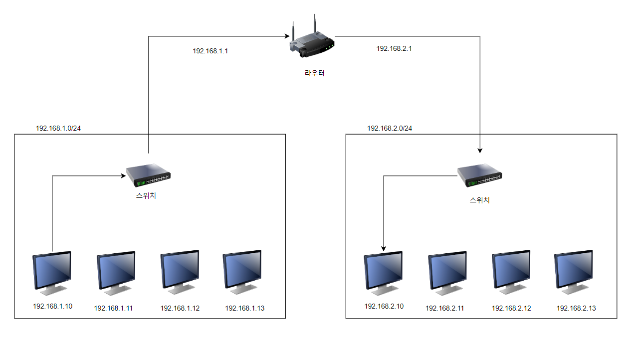 위의 그림을 보시면 192.168.1.10 컴퓨터에서 192.168.2.10컴퓨터에게 데이터를 전송하려 하나, 네트워크 대역이 달라 내부망을 이용해 전송을 하지못합니다.