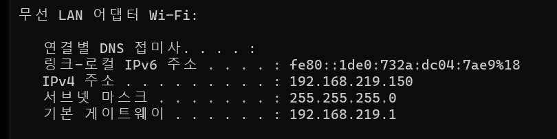 IPv4 주소가 본인 컴퓨터의 사설 IP이고, 기본 게이트웨이가 게이트웨이 주소입니다.