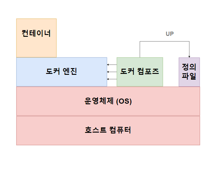 사용자가 UP 명령으로 도커 컴포즈에 정의파일과 함께 명령을 하면 도커 컴포즈는 정의 파일에 있는 정보를 기반으로 도커엔진에 명령을 내려 컨테이너를 생성 및 제거합니다.
