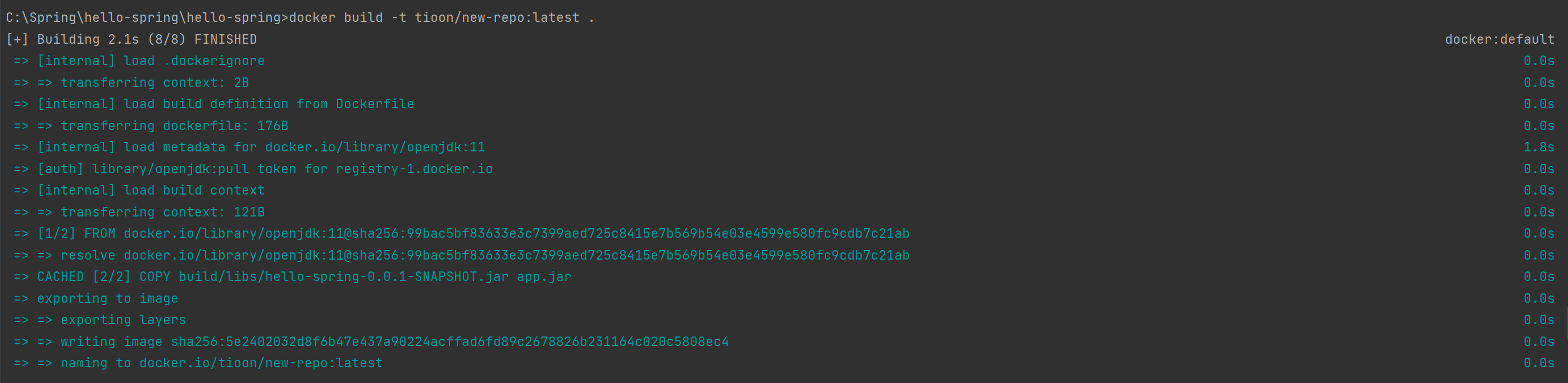 즉, 여기서는 openjdk:11 이미지를 기반으로하며, 스프링 소스 코드와 필요한 패키지들을 추가 설치하여 이미지를 생성할 수 있게합니다.