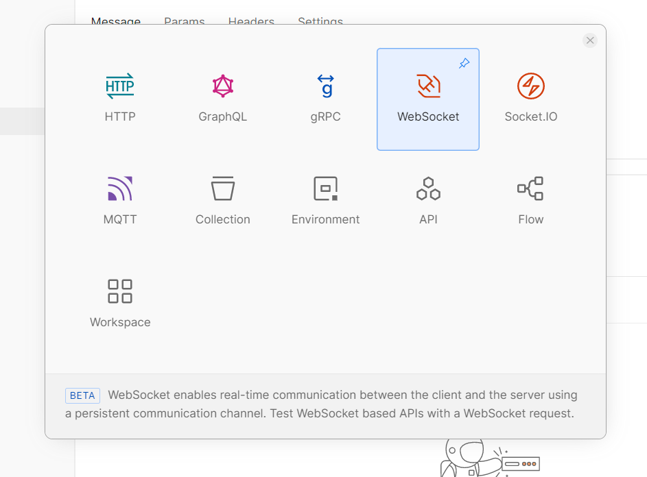 위 사진처럼 HTTP 대신 WebSocket을 테스트할 수 있는 기능이 있습니다.