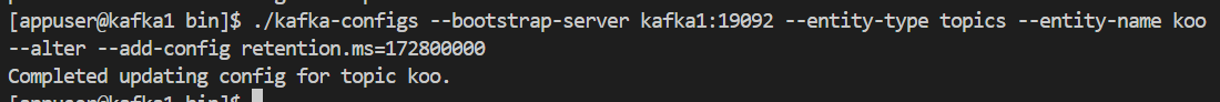 kafka-configs --bootstrap-server [카프카 브로커 주소] --entity-type topics --entity-name [토픽 이름] --alter --add-config retention.ms=[토픽 메세지 보관 시간]
