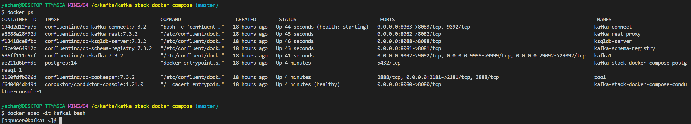 이렇게 8개의 컨테이너중 kafka1에 들어가야하기 때문에 아래 명령어를 통해 직접 shell로 들어갑니다.