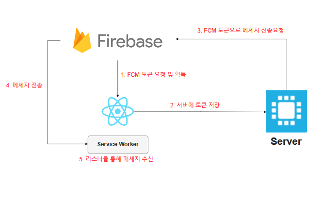 - 백엔드에서 푸시 메세지 발급이 정상적으로 완료 되면, Firebase에서 FCM 토큰의 정보를 바탕으로 해당 사용자에게 푸시 메세지를 발급합니다. 이때 해당 사용자의 Service Worker에게 전송하게 됩니다.