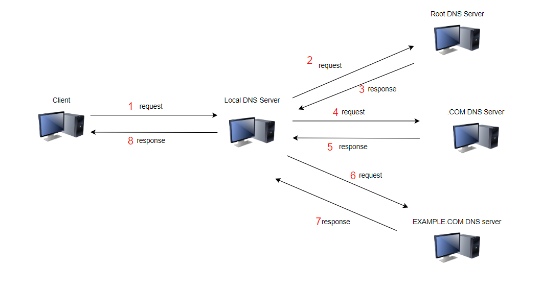 -클라이언트에서 Local DNS 서버로 요청합니다. 해당 서버에서 요청한 도메인의 정보가 있으면 바로 클라이언트로 요청하지만 만약에 해당 서버에 없으면 다음과정을 실행합니다. - Root DNS 서버로 요청 (2,3)