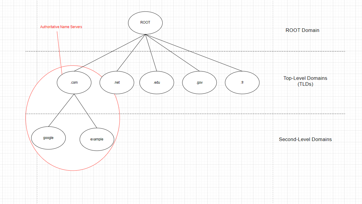 (여기서 빨간색 구간을 보시면 .com에 있는 하위 도메인들과 .com도메인이 묶여있습니다. 여기서 .com은 Authoritative name server인데 해당 DNS ZONE에서 가장 최상위 노드이기 때문에 모든 DNS정보를 가지고 있어 가장정확하게 제공하는 DNS서버입니다.)