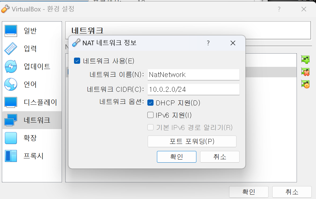버추얼 박스에서 NAT 네트워크를 설정하고 저장하시고 실행하시면 됩니다. 처음하시는거면 이름 부분에 네트워크가 없을텐데 이 가상 네트워크 설정하는방법은 다음과 같습니다.