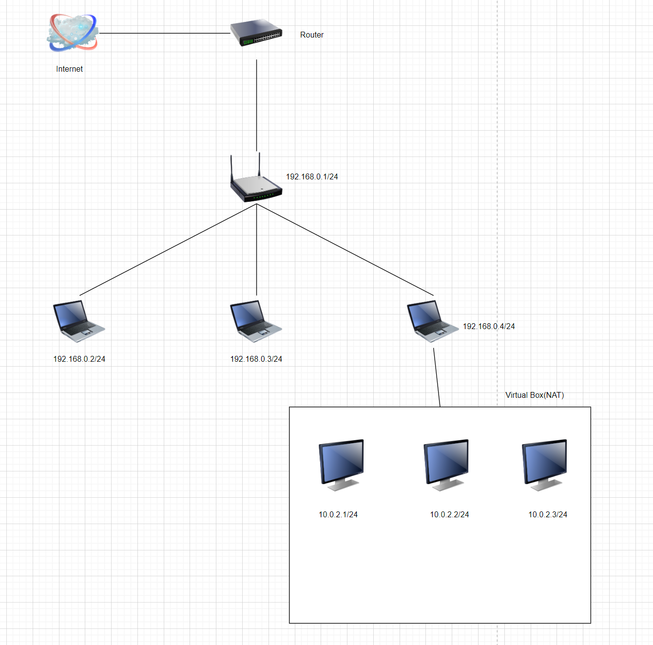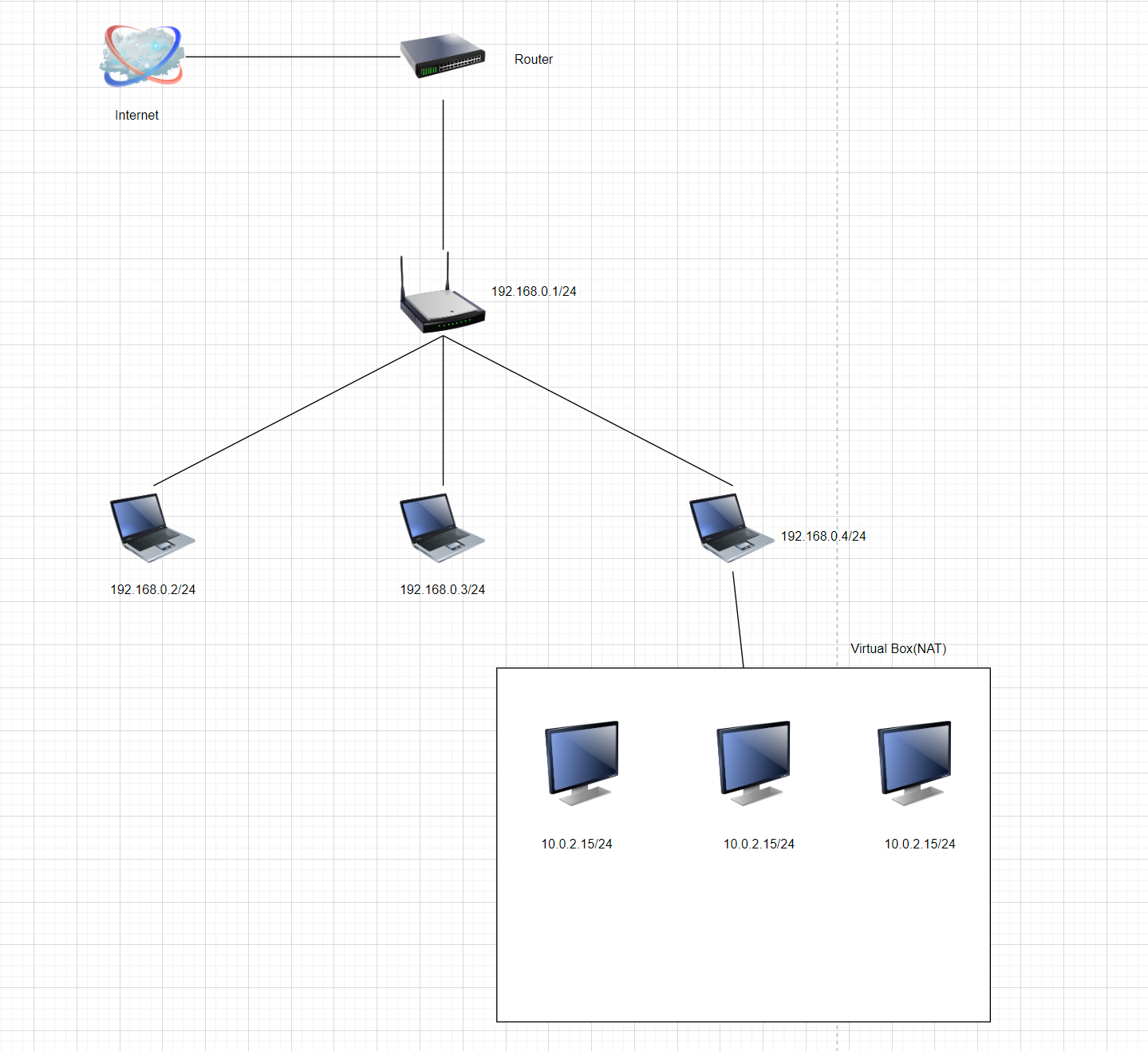 맨아래 3개의 가상 머신이 버추얼박스에서 실행된 가상머신입니다. 버추얼 박스에서 NAT방식은 내부 가상 머신 네트워크와 호스트 컴퓨터의 네트워크 간의 통신이 가능하게 하며, NAT방식을 통해 연결되어있습니다. 하지만 가상 서버 여러대가 있어도 같은 IP로 할당되어있어 3대 모두 외부로 인터넷 통신은 되지만 자기들끼리 통신은 가능하지않습니다. 또한 여러대의 가상머신들의 게이트웨이는 같습니다.