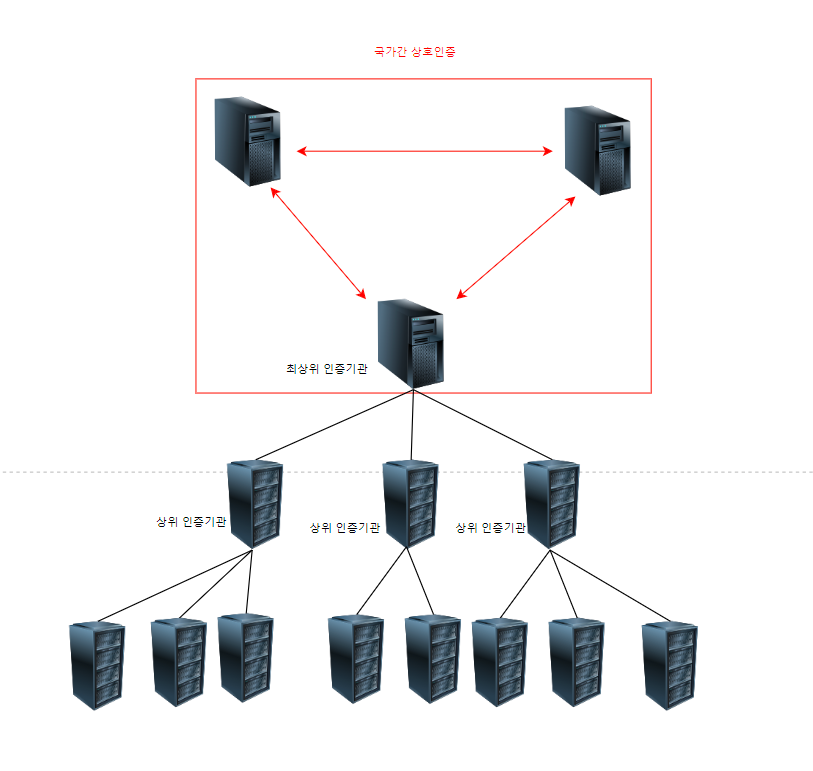 위의 그림을 보시면 최상위 인증기관, 상위인증기관,그아래로 하위 인증기관들이 쭉 있습니다. 여기는 국내에 있는 인증기관들이고, 상위 계층이 바로 하위계층의 인증서를 발급하고, 최상위 인증기관은 인증서에 self-sign을 합니다. 그리고 그위로 보시면 다른 국가의 최상위 인증기관이 있는데, 이들은 서로 peer-to-peer구조로 서로 연관되어있어 서로 상호인증을 할 수 있습니다.