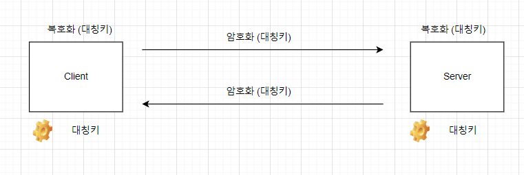 아래 그림을 보시면 Client와 Server둘다 같은 키A를 가지고 있어 암호화와 복호화가 같은 키로 이루어 집니다. 통신하는 노드가 많아지면 키를 각자가져야하기에 복잡성이 생깁니다.