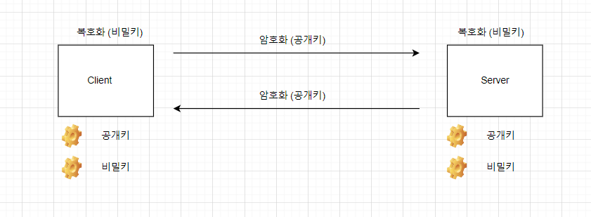 아래 그림을 보시면 서버와 클라이언트 각각 공개키 비밀키를 가지고있으며, 공개키는 모두에게 공개되어있습니다.상대방에게 보낼때 암호화는 보낼대상의 공개키로 암호화를 진행하고, 암호화된 메세지를 받으면 자신이 가지고 있는 비밀키로 복호화 하는 과정을 거칩니다.
