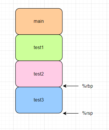 위의 코드처럼 함수가 여러개가 있을때 stack에 저장되는 방식은 다음과같습니다. 한 함수가 다른함수를 내부에서 호출하면 그 내부에서 섞이는게아니라 그 다음공간에 차례대로 할당을 하게 됩니다. 이때 %rbp는 해당함수의 시작점이고, %rsp는 해당함수의 끝점입니다. 이제 각함수가 끝나면 스택 가장 아래서부터 차례대로 해제가 됩니다.