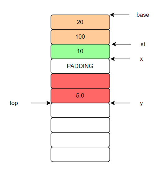 .base가 가장 처음이고 top이 가장최근에 넣은 값이며, base에서 부터 차례대로 st구조체,int x, double y값이 들어가 있는걸 볼 수 있습니다. 여기서 한칸은 4byte이며, 중요한것은 x 저장할때 보면 8byte단위로 계산하기에 padding을 넣어서 잘못 계산하지 않기 위해 한다는 것입니다.